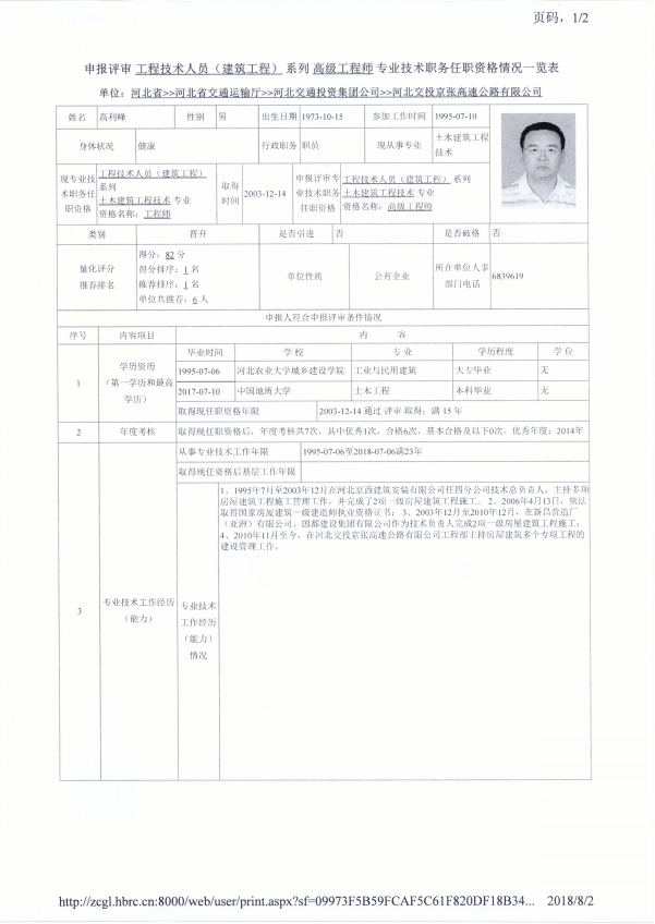 京張公司2018年度專業(yè)技術(shù)職稱申報公示(高利峰)