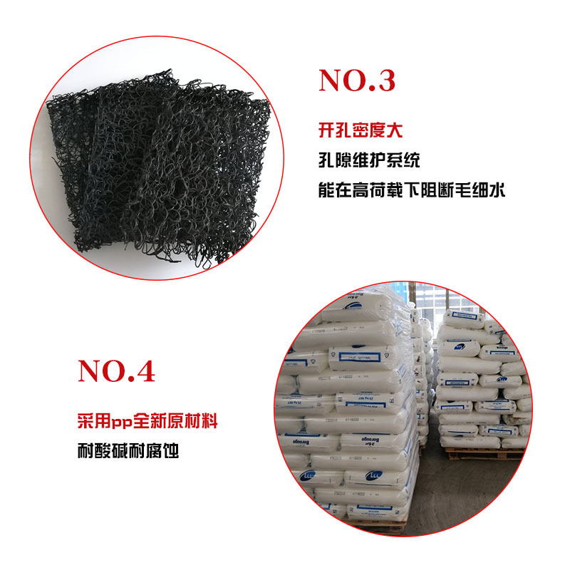 土工席墊與無(wú)紡?fù)凉げ紡?fù)合后,能在掩埋的封閉覆蓋層之下,將匯集滲透過土壤覆蓋層的雨水或堆場(chǎng)本身排放的污水,利用其獨(dú)特的排水功能,按照工程要求從土工席墊夾層中有序排放,而不會(huì)形成淤堵。因此可以避免因土壤覆蓋層吸水飽和而產(chǎn)生可能的滑動(dòng)問題。土工席墊既能排水,同時(shí)也可排放土壤(特別是垃圾廢棄物)中因發(fā)酵產(chǎn)生的沼氣,在垃圾填埋場(chǎng)中應(yīng)用尤其適用。土工席墊與HDPE土工膜結(jié)合應(yīng)用時(shí),同時(shí)能起到很好地保護(hù)HDPE膜不被穿刺的作用。