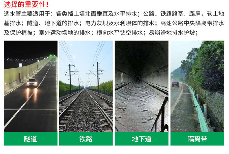 軟式透水管主要適用于:1)各類(lèi)擋土墻背面垂直及水平排水;2)公路、鐵路路基、路肩,軟土地基排水;3)隧道、地下道的排水;4)電力灰壩及水利壩體的排水;5)高速公路中央隔離帶排水及保護(hù)植被;6)室外運(yùn)動(dòng)場(chǎng)地的排水;7)橫向水平鉆空排水;8)易崩滑地排水護(hù)坡;9)屋頂花園及花臺(tái)排水;10)山坡地水上保持11)整地工程的地下排水;12)低洼地排水及鹽堿地改造系統(tǒng)。