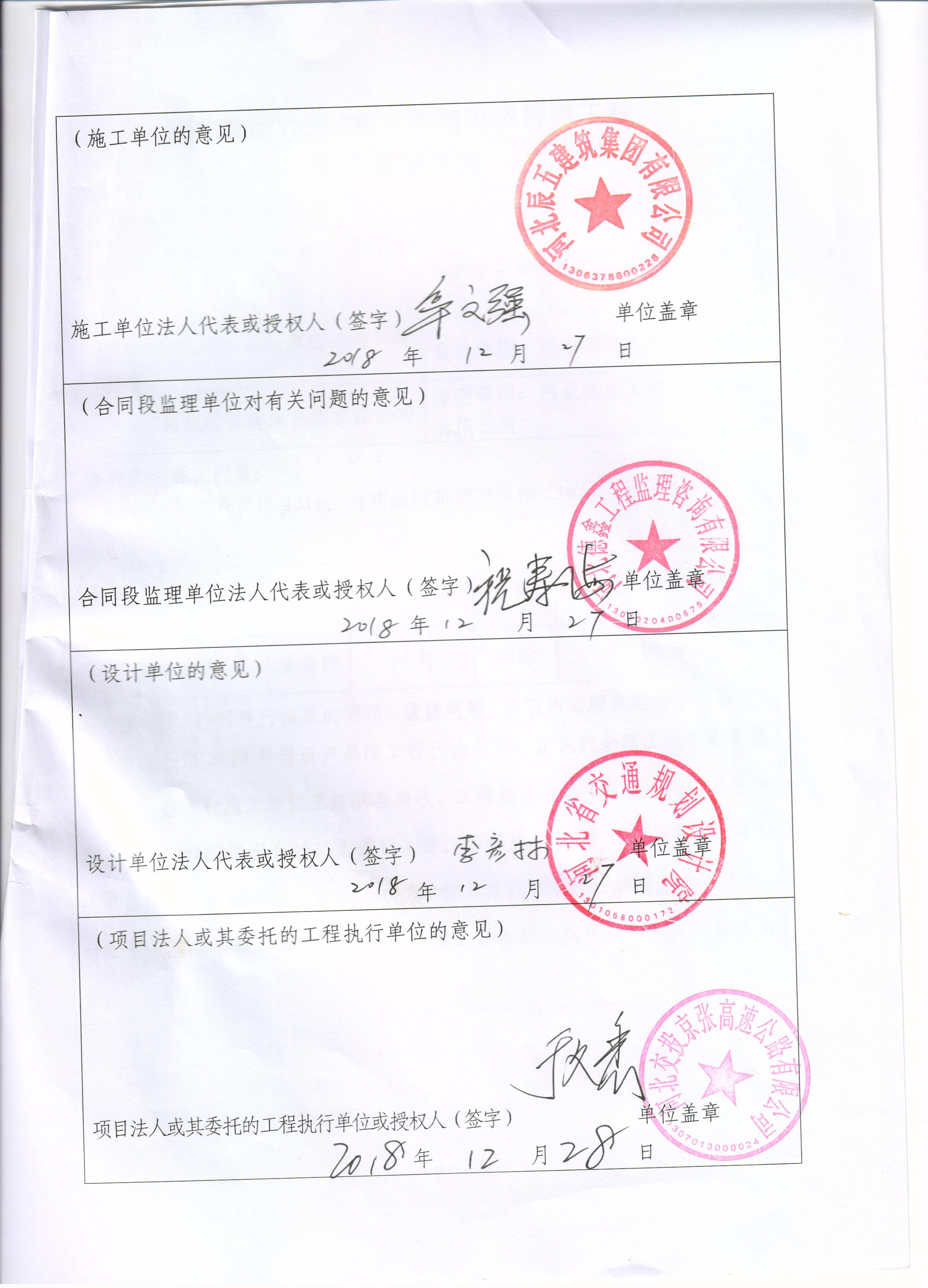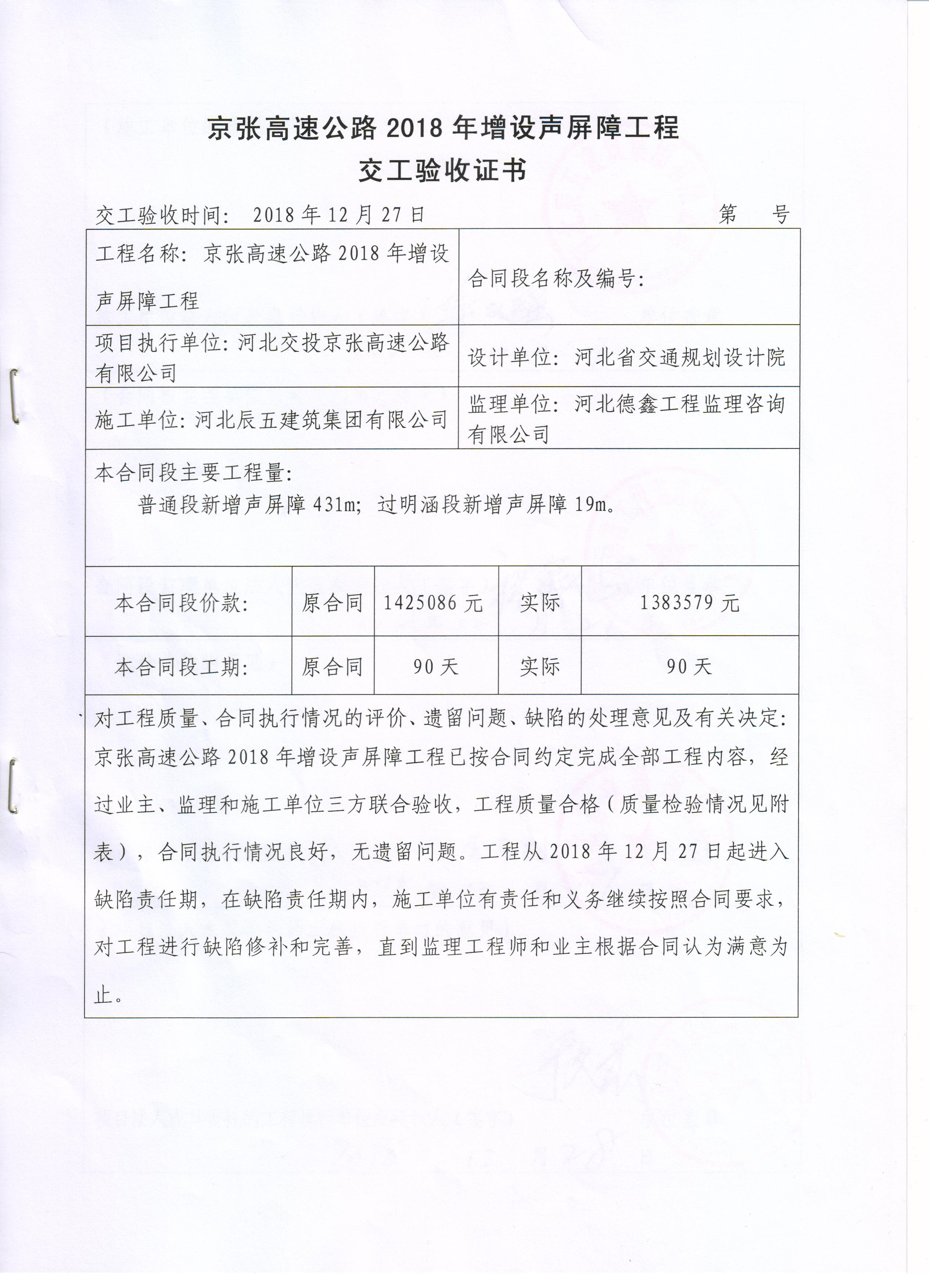 京張高速公路2018年增設聲屏障工程交工驗收證書